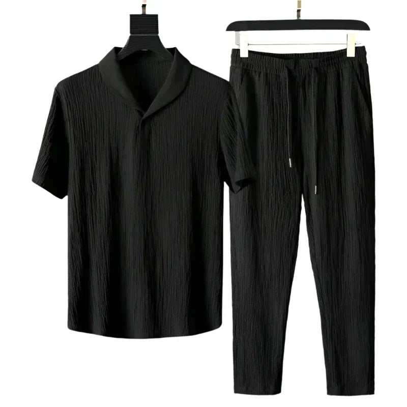 Made from premium textured fabric, this lightweight set ensures you stay refreshed and comfortable all day long. The unique collar design on the shirt adds depth and character to its overall look, giving it a unique appeal. Coupled with the elastic waistband on the pants, this ensemble is as practical as it is stylish.