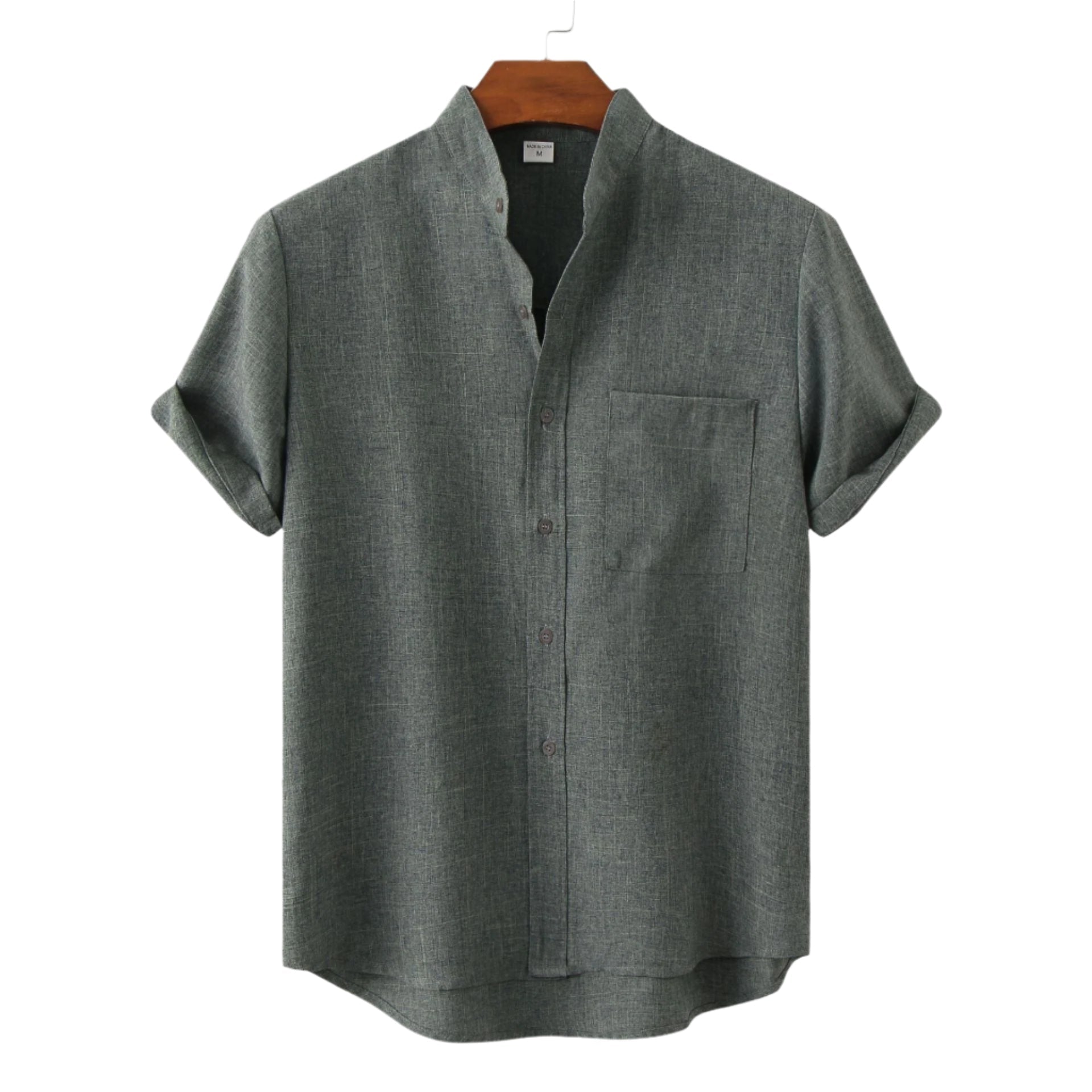 A perfect blend of modern ease and classic refinement, this mandarin-collar shirt exudes quiet sophistication. Its breathable fabric and relaxed silhouette make it an essential for warm-weather styling, whether layered under a blazer or worn solo for a polished off-duty look. Rolled sleeves and subtle texture add depth, making it a go-to for understated elegance.