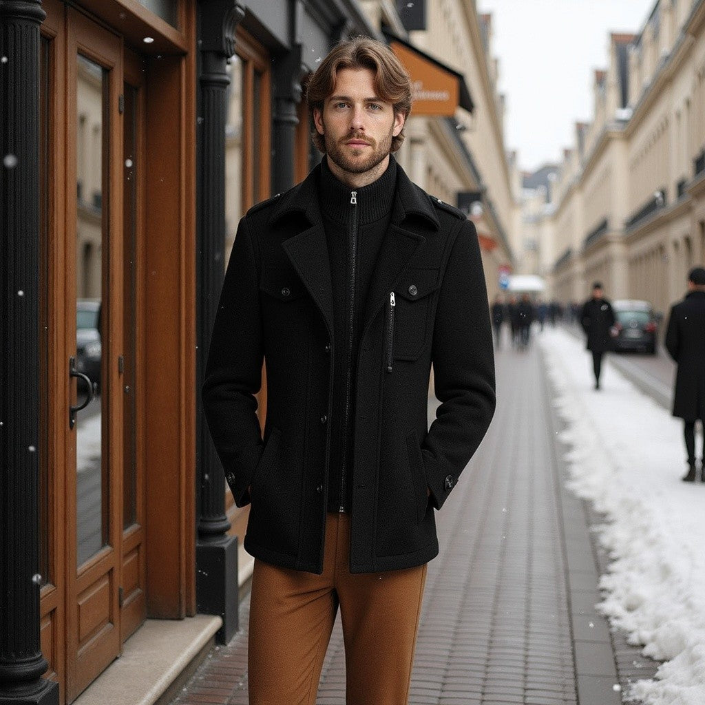 Inspired by classic British tailoring, this coat is for the man who values tradition and timeless style. The subtle military details and structured silhouette make it a staple for those who appreciate quiet elegance and enduring quality